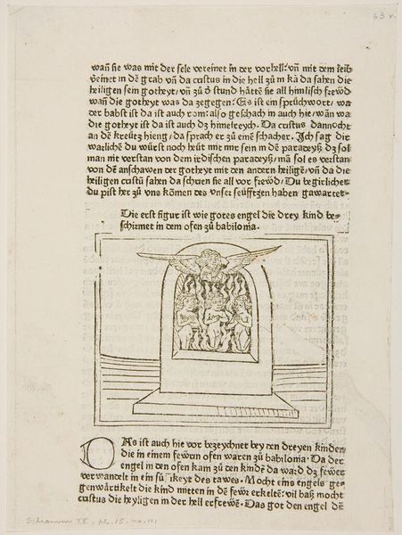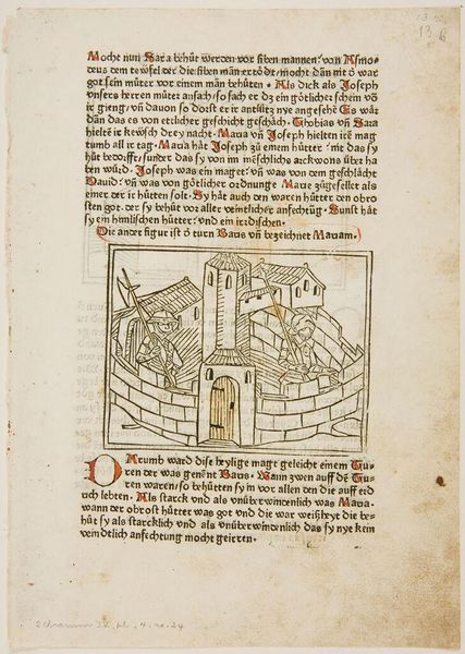 Curator: Here we see a page titled "The Shut Gate Symbolizing the Virgin Mary," by an anonymous artist. What strikes you about this piece? Editor: I'm intrigued by the image of a simple, yet fortified gate. It seems to hold a sense of mystery, almost like a secret. How does this imagery connect with the Virgin Mary? Curator: The shut gate, or "porta clausa," is a powerful symbol. It represents Mary's perpetual virginity, a gate that remains closed, untouched. It draws on the Old Testament prophecies of a gate only the Lord shall enter. Editor: So, the image carries layers of meaning, connecting religious beliefs with visual representation. Curator: Precisely. The gate becomes a vessel of cultural memory, continuously reinforced through its visual association with purity, divinity, and the sacred feminine. What do you make of the text surrounding the image? Editor: The text provides further context, doesn't it? It reinforces the symbolic meaning of the gate, anchoring it within theological interpretations. Thanks, I now see the depth of this seemingly simple illustration.