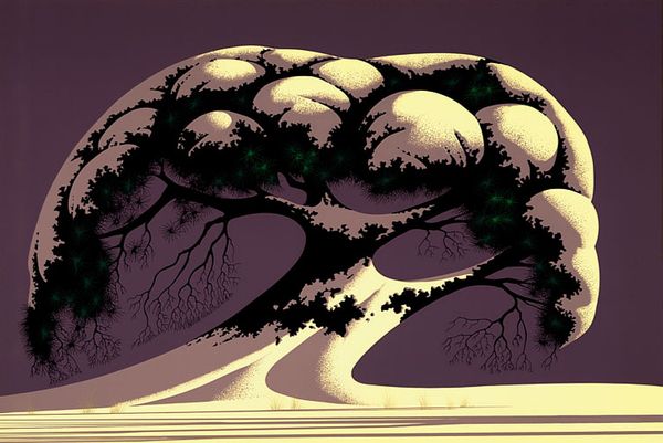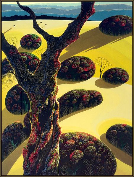 Curator: Good morning. We're standing before Eyvind Earle's "Towering Oak," painted in 1987. Earle was known for his distinctive landscapes and his work with Disney, most famously Sleeping Beauty. He used a glazing technique, building layer upon layer to achieve luminous colors and striking details. Editor: Wow, that light! It's magical. I get the sense of standing at twilight, everything just holding its breath. And the oak—it feels like some ancient, silent guardian. You can almost hear the wind whispering secrets through its branches, even though there aren't any leaves. Curator: Indeed. The dramatic perspective immediately establishes a sense of awe. Notice how Earle meticulously renders the contours of the landscape with subtle gradations of blues and grays, setting up the dramatic stage for this solitary silhouette of an oak. Semiotically, the starkness and absence of foliage invites a contemplation of temporality, loss, or even a kind of resilience in stark beauty. Editor: The landscape is great, sure. But the gnarled, almost animated texture of the tree's trunk is my favorite part. It almost doesn't feel like wood but something much older. Something alive even now! And what's with that small figure grazing at its feet, barely noticeable in the luminous foreground? It shrinks in the presence of the tree, amplifying that imposing and silent, enduring watchfulness. Curator: Precisely. That figure offers an essential scalar counterpoint, accentuating the grandeur of the oak. And while that minimal form provides narrative intrigue, Earle's emphasis is undeniably on compositional elements such as line, shape, and the distribution of light. The eye is inexorably drawn upward by the trunk's lines to that beautifully eerie convergence of branches and twilight sky. Editor: He’s created this delicate dance between darkness and luminescence—as though each is dependent on the other. I love that, the eternal teeter-totter. There's a tension, too. Between the fantastical detail in the tree and the rather muted palette, and the simplicity of the horizon—as if reality itself has been slightly shifted and filtered. Curator: A well-articulated reading. Earle presents not a botanical study but a study in contrasts—between line and color, the intimate and the infinite. It encapsulates, with almost crystalline clarity, the enduring fascination we hold for the power and poetry residing within the natural world. Editor: A powerful, lonely beacon. It kind of feels like hope to me. Like the resilience of something ancient in a vast, unknown future.