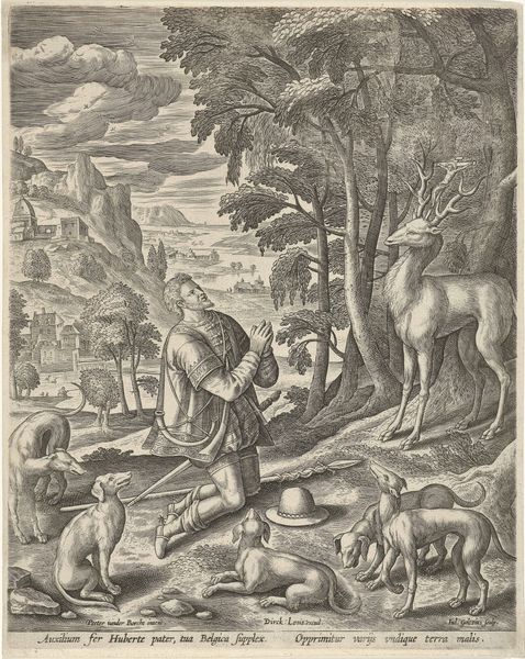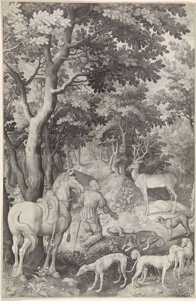 Editor: Here we have Nicolaes de Bruyn’s "Knight, Death and the Devil," an engraving from 1618 currently residing at the Rijksmuseum. The stark contrast and the densely packed imagery give it a rather ominous feeling, don't you think? What stands out to you when you look at this piece? Curator: It is indeed a powerful piece, steeped in the socio-political anxieties of its time. While on the surface it’s a Baroque allegory, its impact lies in its potent iconography circulated via print. Consider the "knight errant" figure, a popular symbol in Early Modern Europe, representing moral fortitude. How do we contextualize his journey alongside Death and the Devil in the shadow of the Thirty Years' War? Editor: So, you're suggesting that beyond the surface-level narrative, there's a commentary on the fragility of morality amidst the widespread conflict of the era? The knight seems resolute, yet vulnerable in this dangerous landscape. Curator: Precisely. The engraving cleverly appropriates medieval morality plays for a new public through the reproducible medium of print. The forest is not merely a backdrop; it becomes a stage where moral battles play out, readily disseminated and debated. Notice the meticulous detail and line work, hallmarks of de Bruyn's training, enhancing the dramatic effect and lending a visual intensity. This creates an immediacy, drawing the viewer into the knight’s perilous quest. Do you see how the distribution affects its meaning? Editor: Yes, it’s interesting to consider how something designed for mass distribution changes the interpretation. I initially saw it as a personal struggle, but its circulation turns it into a larger statement about the societal challenges of the time. I never thought about the implications of "print" being part of the message. Curator: And it underscores the political role imagery played! By examining its distribution and reception, we gain insight into the artist’s dialogue with his audience and the sociopolitical discourse he was participating in. Editor: That is truly fascinating. I'll definitely look at art with a broader historical and societal lens going forward! Curator: Indeed, analyzing art's cultural journey often reveals its profound, enduring relevance.