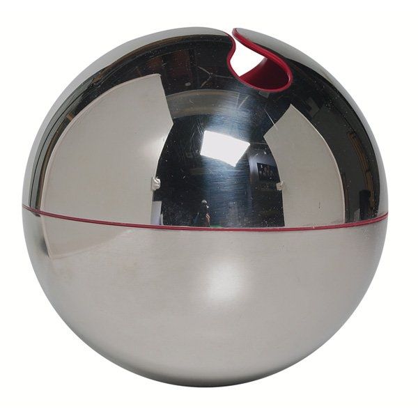 Editor: Here we have Gio Pomodoro's "For Alessi" from 1968, a shiny, almost futuristic metal sphere with an unexpected cut-out revealing a bright yellow interior. It feels like a really interesting blend of industrial design and fine art. What can you tell me about this piece? Curator: Considering Pomodoro's work through a materialist lens invites us to think about process and industrial production. The piece's sleek metallic exterior suggests machine production, standardization, and, of course, a specific economic context. How does the "high art" designation intersect with Alessi, a company that produces everyday objects? Editor: That’s interesting. So, it challenges the distinction between functional design and art? The collaboration itself becomes a statement on consumer culture? Curator: Precisely! We can consider it a critical commentary on the late 60s’ burgeoning consumerism. What about the visible traces of polishing on the metal surface, these little scratches and imperfections? Does it introduce a sense of the "hand-made" or even “labour” that complicates this picture of perfect, shiny, mass production? Editor: That makes me see it differently. The imperfections are a subtle reminder of the work involved, and almost like a rejection of pure, unblemished consumerism. It’s as if Pomodoro is acknowledging the inherent value of labour within a context of industrial manufacturing. Curator: Exactly! By incorporating a found object into an art context, Pomodoro is drawing attention to its previous function and value within the cycle of consumption and repurposing materials for expressive aims. Editor: I hadn’t considered it that way before. I was so caught up in the shiny, space-age aesthetic. Now, I see this commentary on production, consumption, and labor, all wrapped up in this fascinating metal sphere. Thanks! Curator: The real value lies in decoding the history and labour embodied within the materials and forms surrounding us. Food for thought!