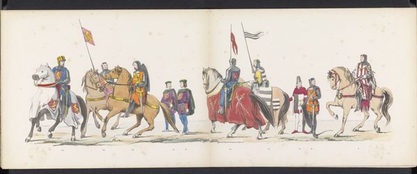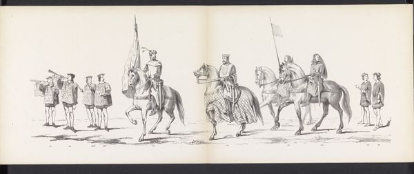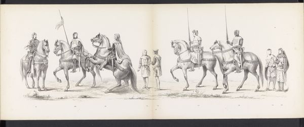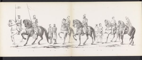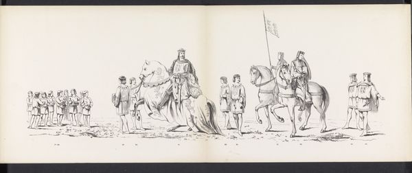 Jan Daniël Cornelis Carel Willem baron de Constant Rebecque created this drawing, "Maskerade van de Leidse studenten, 1865 (plaat 9)", in 1865. The artwork presents two symmetrical groups of figures with horses depicted in monochrome. Notice how the composition uses line and form to organize space. Figures are rhythmically placed across the horizontal plane, drawing the eye from left to right. The artist creates a scene that feels both ordered and dynamic. The symmetry, however, is a key element. The figures are arranged in a mirror-like fashion, but close inspection reveals subtle variations. The artist here destabilizes traditional notions of balance, inviting us to question what is genuinely reflected versus intentionally altered. This visual game reflects broader philosophical concerns about representation and reality. This piece functions less as a historical record and more as an exploration of structure and perception. The artist encourages viewers to actively engage with the artwork, not just as an image but as a site of continuous interpretation.
