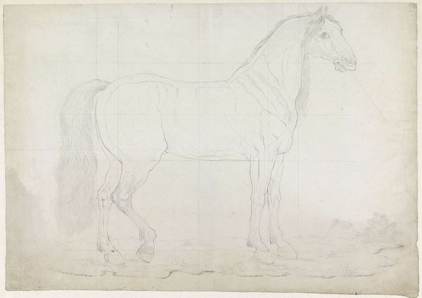 Curator: This delicate drawing is titled "En hest i trav," or "A Horse in Trot," attributed to Lorenz Frølich. It resides here at the SMK, created sometime between 1735 and 1835. Editor: There’s an immediate sense of lightness here; it feels very ephemeral, almost as if the horse could disappear from the page any second. I’m also struck by how much dynamism is achieved with such simple lines. Curator: Absolutely. The dynamism is crucial. Let's consider the cultural moment in which Frølich was working. Horses, then as now, were potent symbols of power, freedom, and even aristocracy. But notice how this isn't a stately portrait; there’s something much more informal happening here. Editor: It's interesting that you mention aristocracy. I see a clear link to equestrian training manuals from that time. It gives the impression of a study, of someone attempting to capture a specific movement, like a material experiment in capturing equine motion and labor. Curator: I agree, the drawing gives us insights into artistic training and technique. However, consider the wider scope of societal influence in his body of work. Frølich’s later pieces depict many figures in scenes from Norse mythology, a key factor in the construction of a nationalist, specifically Danish, identity in the 19th century. It would be reductive to interpret his later life in light of the political implications of national identity-building in Denmark. Editor: The emphasis on raw pencil sketches, like the strokes that barely describe the landscape, invites us to focus on the working method. Curator: It truly does open up conversations. Thank you for considering "En hest i trav" with me. Editor: Thank you. It's compelling to examine this piece through lenses both historical and material.
