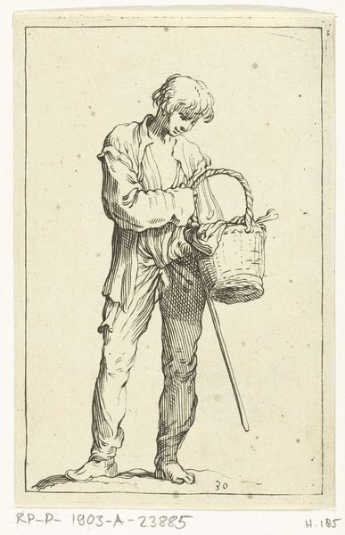 Simon Guillain II created this print, titled 'Boekverkoper' which translates to 'Book Seller' in English. It offers us a peek into the world of 17th-century commerce and daily life. Guillain captures a traveling salesman who is quite literally carrying the weight of knowledge, his basket overflowing with books and writing slates. Book peddlers were the primary means through which written material was distributed to the broader population. They provided access to literature and education, and were crucial in shaping public opinion. The artist portrays the book seller with dignity and purpose. This depiction not only elevates the status of the peddler but also acknowledges the vital role of literacy and knowledge in society. The bookseller, however, would have had a humble existence, representing a life balanced between aspiration and the economic realities of the time.