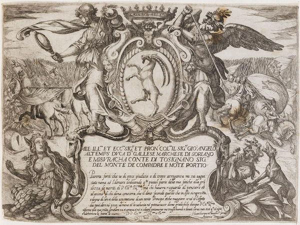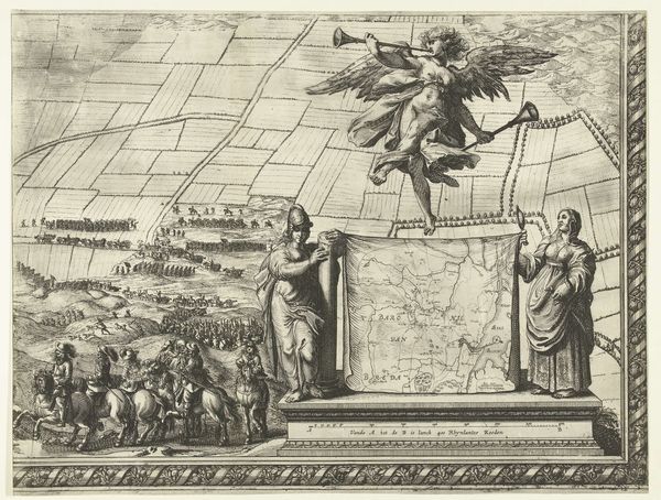 Curator: Adriaen Collaert's "Title Page, with Neptune, Flora, an Image of the Globe, and Portraits of Explorers" is an engraving. The density of the line work, the very *making* of this image, interests me most. Editor: It’s incredible how much detail he achieved with just lines! What do you see in this piece beyond the technical skill? Curator: I see a celebration of global power and commerce, built, literally, on exploiting labor and resources. Consider the materials required: the paper, the ink, the metal plate used for engraving – each with its own network of production and impact. Editor: So, you're saying it’s not just about the image itself, but also about the resources and labor that made it possible? Curator: Precisely. The means of production become central to understanding its meaning and impact. This work, though beautiful, represents a complex system of resource extraction. Editor: That’s a perspective I hadn’t considered. I appreciate learning to look at art this way. Curator: Indeed, questioning the materiality behind the image gives us a richer understanding.