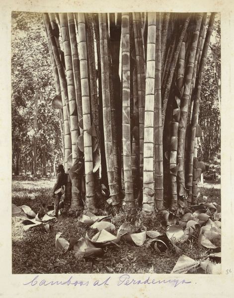 Editor: This photograph by Isidore Kinsbergen, potentially taken in the late 1860s, showcases a stele with features of Harihara in Kediri, Indonesia. The sculpture, cradled within the roots of an enormous tree, almost feels as though it's being birthed by nature. What draws your attention when you look at this image? Curator: Immediately, the photograph brings to mind the interplay between nature and culture, between the raw material of the earth and the human labour that shaped the Harihara stele. Considering that this stele appears to be photographed in situ, what do you make of its relationship to the site? Editor: It blurs the lines between sculpture and site-specific art. It makes me wonder, was the tree already there, and the sculpture intentionally placed to integrate with it? Or perhaps even carved *into* the tree? The choice of material would then become crucial. Curator: Precisely. The labor involved in quarrying, transporting, and carving such a stele would have been immense. And situating it like this, seemingly absorbed by the very landscape it’s meant to stand apart from, subverts our understanding of both the artwork's production and its consumption. How does that relate to notions of “high art”? Editor: It challenges that completely. Instead of a detached, elevated object, it's deeply intertwined with its environment and possibly local spiritual practices, erasing boundaries we often impose. The skill involved in sculpting something that also feels so natural almost democratizes the concept of art. Curator: The photography itself is key. Kinsbergen is not just documenting; he's framing a relationship between materiality, labor, and the landscape itself, opening dialogues about access and contextual significance that remain relevant today. What started as documentary photography of cultural artifacts, became evidence of cultural history being captured, in the present tense. Editor: I hadn't considered the photographic process as part of that material chain, but of course, it adds another layer of interpretation and labor! That changes how I see the image significantly. Curator: Indeed. This piece now stands out to me as an excellent point for expanding discussions about traditional assumptions tied to “Art” and the accessibility to view that history.