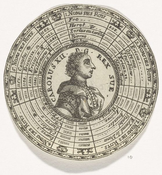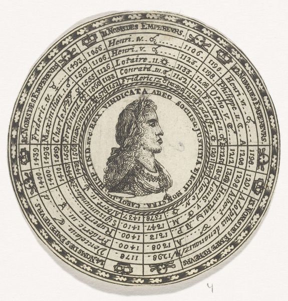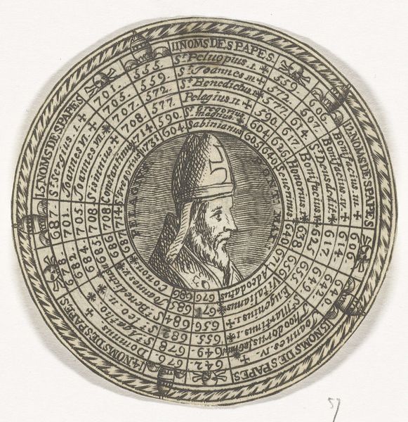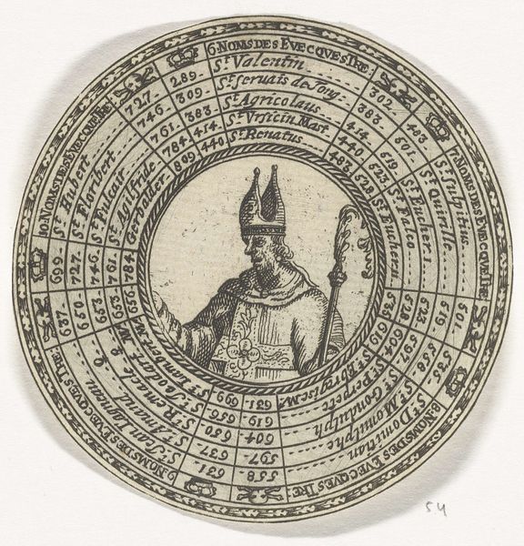This circular print, made by an anonymous artist, depicts Bishop Walcand and lists the Bishops of Liege. Prints like this served an important social function in early modern Europe, shaping historical memory and civic identity. Note the carefully inscribed lists of names arranged in concentric circles around the central figure of the Bishop. This visual organization suggests a divinely ordained succession of power. The print would have been a form of propaganda, reinforcing the authority of the Catholic Church in Liege, a region with a complex political history caught between larger European powers. As a historian, I’m interested in how this image participates in the construction of historical narratives. To understand it fully, I’d want to consult archival records, religious texts, and political pamphlets from the period. Understanding the social and institutional context is crucial to unlocking the print's meaning.