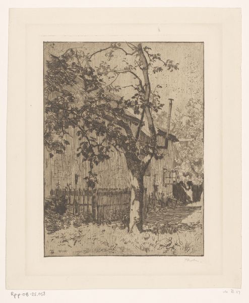 Editor: This is "Wilg," an etching by Johannes Löhr, likely created sometime between 1892 and 1928. I'm really struck by the level of detail in the tree bark and the texture of the foliage. It feels so tactile! What is your read of the piece? Curator: Look closely at the marks that constitute the image. Notice how Löhr used the etching process to translate the physical world. We have acid etching away at a metal plate, the labor involved in repeatedly submerging, in applying the resist, in making choices. The landscape genre itself connects to land use and ownership, which carries its own socio-economic weight. Consider also how easily prints are reproduced and consumed. Editor: That's fascinating. So, you're saying the medium itself – etching – and the way it’s been used speaks to a broader system of production and access? The image itself depicts nature, but its creation implicates systems that actually shape our relationship to the environment? Curator: Precisely! And look at the recurring horizontals: the planks of the fence, the implied horizon line... These are artificial lines imposed on the "natural" world, visual cues about human intervention and control. How do you see this playing out further? Editor: The very choice of landscape could reflect societal views on nature and agriculture during that period, as a resource but also something to be cultivated. The artist isn't simply showing us a pretty view but revealing the complex relationships between people, work, and land through the printmaking process. It brings a new perspective to considering an artwork's themes. Curator: Absolutely. Reflecting on the relationship between the artwork, material, and historical context is so vital. Thanks for making the connections visible. Editor: Thank you. I now see there is so much more to art analysis beyond only looking at what it is; it is also imperative to understand how art comes into being.