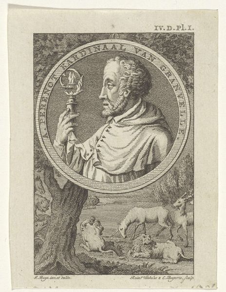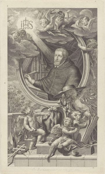 Curator: This engraving, created by Bernard Picart in 1713, is a portrait of Pierre de Foix. It’s currently held in the Rijksmuseum. The baroque style, the detail in the line work... it all really sings. Editor: It's arresting, isn't it? Almost severe. That intense gaze feels very confrontational for a religious figure. And what's with that chubby cherub? He looks less angelic and more like he’s about to swipe my wallet. Curator: That contrast, I think, is key to understanding its function. As a print, this image would have been widely distributed. While honoring Pierre de Foix, the portrayal reinforces the power and authority of the Church. The baroque exuberance clashes intriguingly with what you see as the subject's severity, highlighting this tension. Editor: The theatrical elements amplify the intended drama then? That’s interesting. You have this almost comical cherub propping himself up a column and these other mythical creatures almost erupting into frame…it does command attention, regardless of your personal affinity for the Cardinal. I'm particularly struck by those dragon-esque monsters writhing near the base. Are they meant to symbolize heresy vanquished? Curator: Precisely. That’s very probable. See how they’re positioned, subdued beneath the pillar and the cherub… the print certainly projects an air of triumph, emphasizing Pierre de Foix’s role in resolving the Great Schism, which the inscription along the bottom alludes to. The whole composition is meticulously crafted to deliver that message. Editor: Looking at it in that light, the rigidity makes more sense. This isn't just a likeness; it’s a carefully constructed argument meant to project unwavering power. Knowing the historical context changes everything, doesn’t it? I initially saw just an odd portrait, now it reads as a statement about institutional dominance. Curator: Exactly. It’s that layering of history and artistry that makes pieces like this so fascinating. There's always so much more going on beneath the surface. Editor: A reminder that even the seemingly straightforward image can be a loaded weapon of ideas. Fascinating.