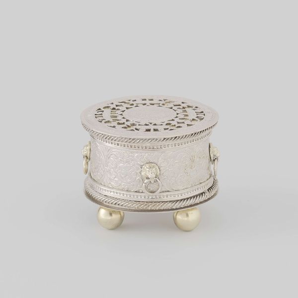 Curator: Here we have a "Tabakspot," or tobacco box, crafted in 1770 by Frederik Sleuman. It's a small, almost severe object fashioned from silver. What's your initial impression? Editor: Strikingly minimalist, isn't it? The geometric forms feel… inevitable. The subdued shine and clean lines speak of restraint, but with a definite gleam of luxury, like whispered secrets of aristocracy and ritual. Curator: Ritual is apt. Tobacco, by this time, was very much a part of daily life for certain strata of society, requiring special objects and presentation. Sleuman’s choice of silver is significant; its malleability allowing for detailed ornamentation, or, in this instance, restrained elegance. Notice the simple flower or star finial on the lid. Editor: Yes, that touch is almost a flourish! Its angular, almost stylized petals are the only real decoration. And the facetted design - how do the repeated hexagonal forms contribute to the box's austere beauty? Curator: The facets catch light in a controlled way. More importantly, though, the repetition brings our attention to the object's proportions. The overall effect is that of a precious jewel scaled down, something self-contained. I can’t help but wonder, though, what kinds of tobacco it held. Editor: Its compact dimensions seem designed for holding fine leaf, carefully measured doses. Did tobacco represent access or some kind of escape, would you say? Curator: Perhaps a little of both. Consider also that a tobacco box, like this, would likely have been placed prominently during social gatherings, silently broadcasting the owner's affluence and cultivated habits. These things spoke volumes in 18th century society, more loudly sometimes than their voices. Editor: What really lingers with me is how its pure, geometric simplicity can provoke such thoughts! There is no single focal point, so the mind gravitates towards interpreting all. It's less about direct statement and more about indirect cultural coding and associations. It prompts deeper inquiry and even provokes the senses in an indirect way. Curator: Precisely. In this compact silver vessel, Sleuman managed to encapsulate an entire social dynamic, and a potent one at that.