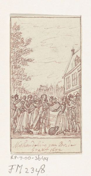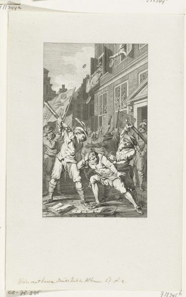 Editor: This engraving, "Afhalen bij patriotten te Zutphen van trommels en vaandels, 1787," created in 1796 by Reinier Vinkeles, depicts what looks like a moment of seizure in a city street. It's got a rather chaotic energy, created by the lines suggesting so many different directions and intentions. What compositional elements stand out to you in this print? Curator: Immediately, the dynamic arrangement strikes me. Vinkeles uses line masterfully to direct the eye. Notice how the receding architecture, rendered in precise detail, creates a perspectival framework. Within this framework, the figures are not merely placed, but actively arranged to build an expressive tension, don't you agree? The high contrast between the light and shaded areas further enhances the emotional impact of this politically charged scene. How do the light and dark tones contribute to your experience? Editor: Yes, the contrast definitely amplifies the drama! The figures almost seem to be acting out a stage play because of this contrast and the linear, sharp details throughout. The orthogonals really lock the composition down while everything within it feels so full of motion and life. But can formalism really account for the artist's representational choices in depicting political action? Curator: Representation, of course, matters, but it is the articulation of forms within the frame that offers a portal to interpreting the content. We see that Vinkeles exploits the printmaking medium itself to generate this tension. By what means does he employ the physical character of the line in service of the subject depicted? Look carefully at the different densities of the lines used in rendering fabric versus sky. Editor: The line work seems strategic; finer lines suggest distance and atmosphere. The heavy, etched lines defining the figures closer to us really give them weight, and this makes them appear solid against the openness of the rest of the print. Curator: Precisely. So we see how the artist has constructed a layered reality using the material resources available, organizing the engraving’s forms according to underlying principles that articulate meaning. The formal elements absolutely amplify the political content. Editor: I see now how analyzing the composition through formalism sheds new light on interpreting Vinkeles' choices! It adds to a better understanding. Thank you.