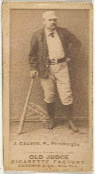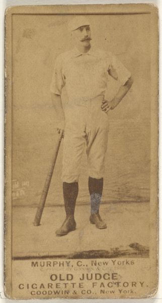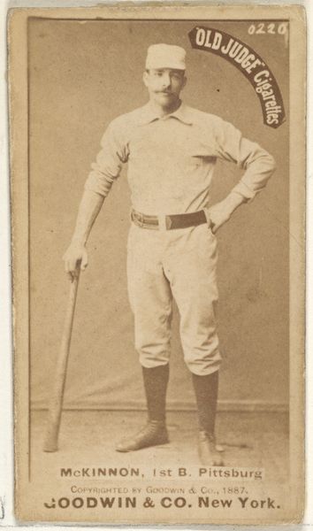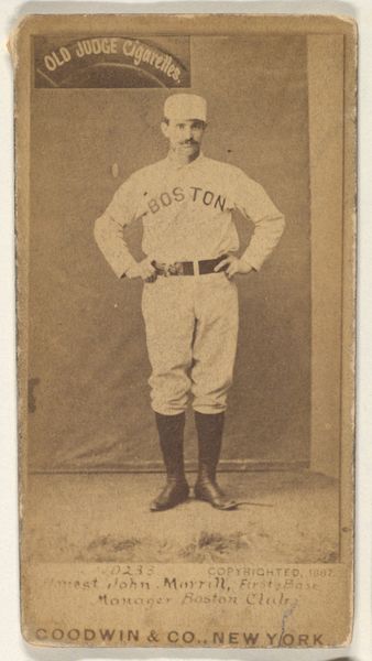 Curator: Up next we have a very early baseball card. It’s a portrait of Burdock, 2nd Base, Boston, from the Old Judge series created in 1887 by Goodwin & Company. These cards were originally included in packages of Old Judge Cigarettes. Editor: It has a sepia tint, almost like a memory fading into time. The player, Burdock, has a firm stance. He's not smiling. Serious business. I’m sensing a tension here—between athleticism and commercialism. Curator: Absolutely. These cards highlight the intersection of burgeoning sports culture and aggressive marketing. Think about it: cigarettes appealing to fans through images of athletic prowess. We should also acknowledge that baseball itself, at this time, wasn’t free from the social stratifications of race and class. Editor: Right. It’s fascinating how seemingly simple portraits carry those implicit narratives of labor, consumption, and leisure in 1880s America. How tobacco companies are trying to attach themselves to an all-American symbol. Who gets to be on these cards and who doesn't is a power dynamic. Curator: And these cards circulated widely, reinforcing cultural values tied to both the sport and the act of consumption. Consider too, how the visual aesthetic, the sepia tone as you mentioned, created a nostalgic feel even then. It linked the present moment to an idealized past. Editor: Looking at this card, the "Old Judge Cigarettes" signage placed prominently above Burdock feels quite blunt by contemporary standards, there isn’t a huge interest in nuance here, that brand visibility comes before anything else. How does that open a wider conversation about sponsorship, gender, or racial considerations at the time? I'm also curious about what we can discover by researching more on Goodwin & Co. Curator: By examining such ephemera like these, we glean valuable insights into the ways images worked—and continue to work—to shape perceptions and normalize ideologies. It's much more than just a baseball card. Editor: Agreed. There is more at stake here than a single baseball portrait and thinking more critically helps to expose social power dynamics and contextual assumptions that impact visual art.