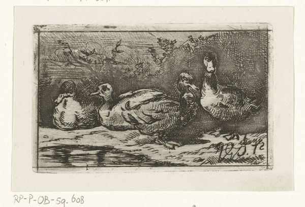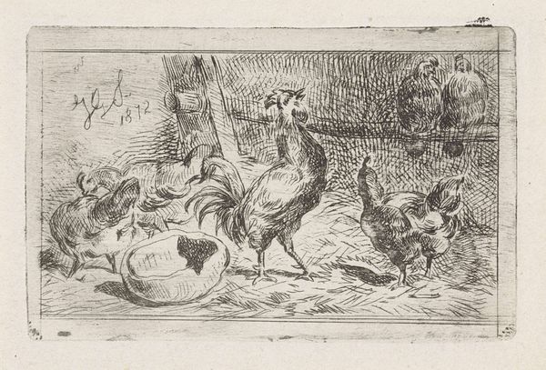 Curator: What a delightful, slightly mischievous-looking scene. Editor: Indeed! The texture immediately grabs my attention. There's a tangible roughness to the pen strokes creating the chicken coop. Curator: We're looking at “Kraaiende haan met kippen in een hok,” or "Crowing Rooster with Chickens in a Coop", dating back to 1872 by Jan Gerard Smits. What interests you about the material rendering of the artwork? Editor: Well, Smits’ cross-hatching gives the piece a wonderful grittiness. It speaks of the actual labor involved in raising chickens – the muck, the straw, the enclosure itself. Curator: It's interesting how this seemingly simple domestic scene can reflect broader societal values. Depictions of rural life, especially in the 19th century, were often loaded with idealizations of nature and honest work. Editor: Absolutely, and the very directness of the drawing seems almost defiant of that idealism. He shows us the confined space, the practical feeding bowl. It’s a workspace for the birds. Curator: I also notice that even with its confined composition, there is a dynamic interplay of social status. The rooster, centrally placed, embodies authority, a tiny patriarch within his small kingdom. Editor: You can almost hear the squawking and feel the tension! Look at the scratchiness he uses to render their feathers; it speaks to the constant movement, the bustling life within that small space. It hints at an almost factory-like process of egg production! Curator: The artwork’s social context becomes evident when we consider how land ownership and agricultural practices shaped society, which had considerable social impacts at the time of the painting's creation. Editor: And considering how rapidly industrialization changed lives. People needed reminders, perhaps sanitized or raw like this. Curator: It is quite insightful how a seemingly simple pen sketch prompts considerations of broader social and economic structures, from rural realities to the impacts of industrialisation. Editor: For me, thinking about the craft of it, the very labour Smits put into the materials to give us this tangible scene, deepens its resonance.