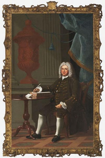 Curator: Here we have John Singleton Copley's portrait of John Adams. What's your initial take? Editor: Oh, he seems terribly serious, almost severe! It’s a commanding presence, yet the backdrop feels like a stage set. Curator: Indeed. Consider Copley’s access—or lack thereof—to his sitter. The painting was likely produced in London based on sketches and descriptions, influencing the final composition. The presence of the globe and classical figure, likely added for gravitas, speak to a strategic construction of identity. Editor: I can feel the distance. It makes me wonder about the real man versus the persona Copley was tasked to create. All those symbols, the carefully placed scroll... it feels a bit like costuming. Curator: The materiality also speaks volumes. The imported pigments, the linen canvas itself—all point to transatlantic trade networks and the economics of portraiture in the 18th century. Editor: It’s fascinating how those details give the painting so much depth. Now, it's not just a portrait but a portal! Curator: Precisely, an artifact embedded in a web of social and economic relations. Editor: A serious man, indeed, but also a symbol of something so much larger than himself.