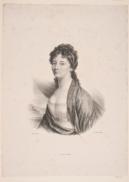 Editor: So, this is Henri Grevedon’s lithograph from 1825, "Marie Christine Caroline d'Orléans, Mademoiselle de Valois." The delicate lines create an almost ethereal quality. What strikes me is the subject's rather restrained demeanor. How might this portrait be interpreted in the context of its time? Curator: That's a very astute observation. In looking at this, we must consider the sociopolitical currents influencing artistic production during the Romantic era and its revival of portraiture. The subject's composed posture speaks volumes. Who was Mademoiselle de Valois? She was a member of the French royal family during a period of immense upheaval. Her portrayal here, reproduced and disseminated through lithography, presents a specific image for public consumption. What image do you think the Orléans family was attempting to convey? Editor: Perhaps an image of stability and refined grace during a period of revolution? Curator: Precisely! The romanticized aesthetic softens any potential challenge to power, using sentimental imagery to appeal to popular sensibilities. Note the choice of lithography. A relatively new medium, but one able to be mechanically reproduced and democratized. Editor: That's fascinating. I never considered the deliberate political angle within seemingly benign portraiture. What do you make of her specific dress and hairstyle? Curator: They reinforce the image. Her carefully arranged curls and modestly adorned gown speak of controlled femininity and familial propriety – important ideals for projecting the family's dynastic power in the era. This echoes earlier aesthetic propaganda but also reveals the changes brought by revolution. Editor: It's amazing how much social and political context can be unpacked from a single image! I see this in a whole new light. Curator: Exactly. Art isn't created in a vacuum, but within layered frameworks of power and influence.