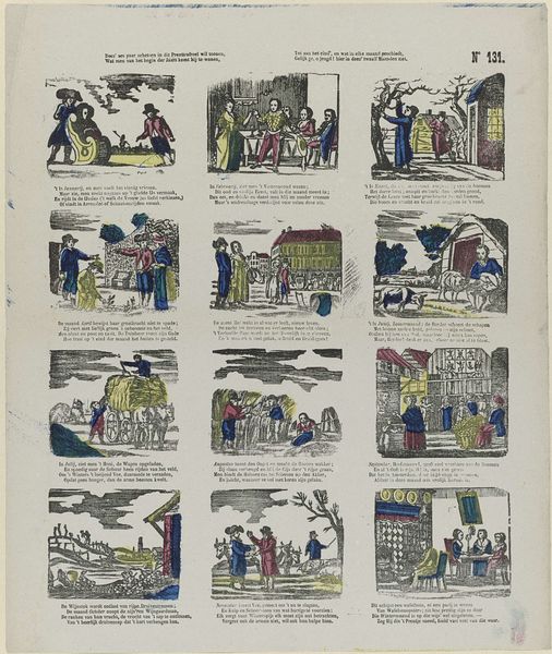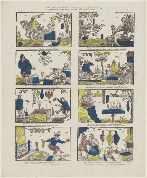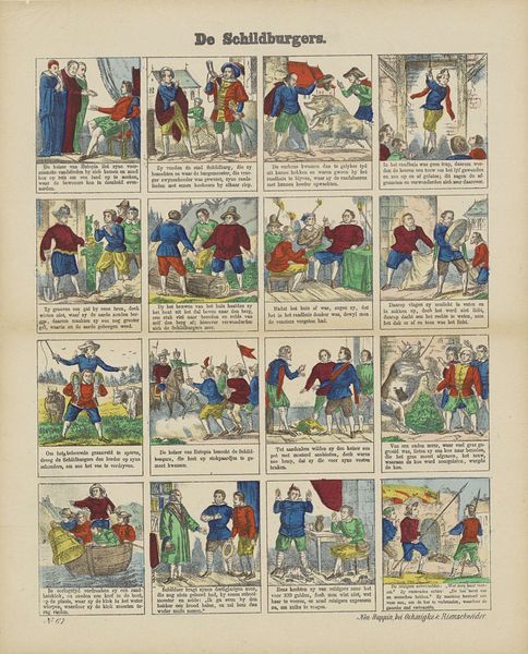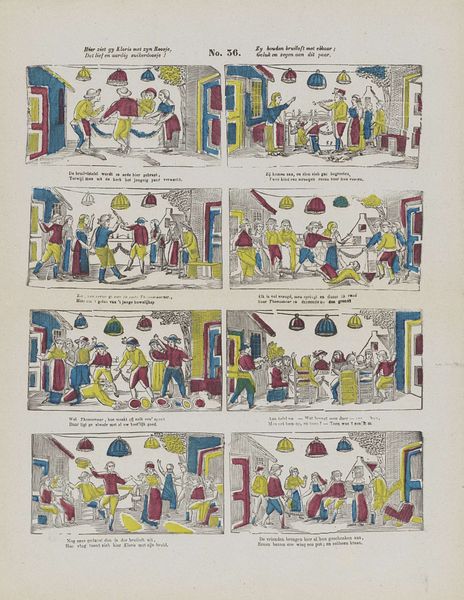 This illustrated print titled "Bruiloft van Doris en Roosje" by Glenisson & Van Genechten uses simple lines and blocks of color to narrate a wedding. The printmaking process itself—likely a woodcut or engraving, then hand-colored—is key to understanding the artwork. The clean lines and flat colors were economical, making the story accessible to a wide audience. The limited color palette and repetitive figures point to the social context of mass production and consumption. These processes also allowed for the easy distribution of moral tales and social customs, reflective of a burgeoning print culture and capitalist system. The comic strip style and sequential panels speak to the growing literacy and demand for affordable visual storytelling. Consider how the materials and production methods shape the narrative and reflect the changing social landscape of the time. This isn't just an illustration; it's a cultural artifact deeply embedded in the processes of its making.