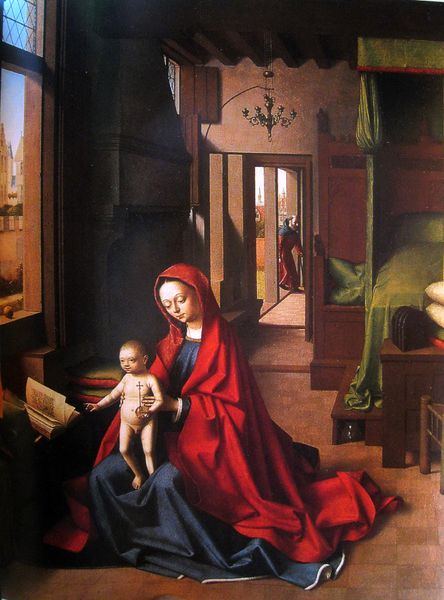 Editor: Here we have Hans Memling's "Nativity", an oil on panel painting, probably from the late 15th century. I'm struck by the juxtaposition of the very earthly, almost rough-hewn stable setting, against the ethereal figures of Mary and the angels. What significance do you see in that contrast? Curator: The contrast highlights a key theme in art of that period: the intersection of the divine and the everyday. Think about the commissioning context: often, these works were placed in domestic settings, blurring the line between personal devotion and public display. The very act of commissioning such a painting spoke to a patron's social aspirations as much as their religious piety. The rough stable underscores the humble origins of Christ, a popular theme at the time, wouldn't you agree? Editor: I do, but the stable also feels very stage-like, almost as though the landscape is a backdrop, and I wonder what that framing says about how the scene was consumed, beyond purely devotional practices. Curator: Precisely! It’s less about replicating a realistic event and more about presenting a powerful symbol. This idealized depiction offered a vision of religious harmony within a stable, ordered world, perhaps reflecting the patrons desire for that stability within the society, in light of increasing urbanization and societal shifts occurring at the time. Editor: So, this wasn’t simply a depiction of faith; it was a subtle declaration of values within a changing world? Curator: Indeed. The Nativity was more than just a religious scene. It was also a statement about wealth, power, and the patron's role within society, and it is that layering that gives it longevity, I would argue. Editor: That's really reshaped how I see this painting. I went in thinking this was purely religious, but understanding the cultural context makes it far more complex. Curator: That's the power of history – revealing the hidden conversations embedded within the artwork!