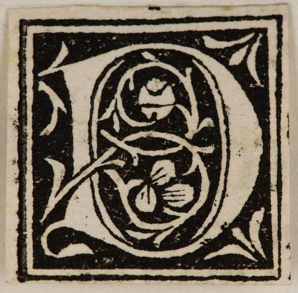 Editor: This is "Initial B," an undated print by an anonymous artist. It's a blocky letter "B" surrounded by floral patterns. It feels very medieval to me. What compositional elements stand out to you? Curator: The stark contrast between the black ink and the white paper creates a strong visual dichotomy. Note how the internal floral elements mirror the larger form of the “B”, echoing structure within structure. What does this contrast evoke for you? Editor: It makes the letter pop, like it's emerging from the darkness. The floral details also soften the harshness of the black ink. Curator: Precisely. The use of negative space is equally important. Notice how the white areas within the letter create a delicate balance with the bold black lines. The artist masterfully employed line and form. Editor: It’s amazing how much complexity and visual interest they packed into such a small space. Curator: Indeed, a testament to the power of formal elements in art.