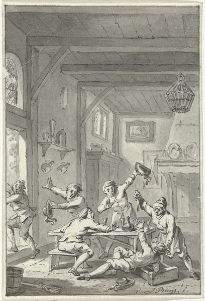 Editor: We're looking at Reinier Vinkeles' "Illustration for the novel Gustav Lindau," a pen and ink drawing on paper from around 1780-1785, currently held at the Rijksmuseum. What strikes me most is the staged, almost theatrical composition. The grayscale tones create a rather somber, intimate mood. What do you make of this artwork? Curator: Indeed. The formal arrangement of figures, a central protagonist surrounded by a chorus, echoes classical compositional strategies. Notice the strategic placement of the light source—likely from the window implied on the left—that emphasizes the kneeling woman’s supplication. Do you observe how Vinkeles uses line weight and hatching to define form and create depth? Editor: I see how the lines are much finer and more delicate in the background compared to the bolder lines outlining the main figures, bringing them forward. What’s the effect of that contrast? Curator: It creates a deliberate hierarchy. The sharp delineation around the central group compels the viewer's focus, guiding us to interpret their gestures and interactions as paramount. Moreover, the contrast enhances the tactile quality of the rendering. Do you agree? Editor: I do. I also noticed the architectural elements in the background. They seem almost sketch-like in comparison to the figures. Is there a reason for that difference in rendering style? Curator: It suggests that the narrative—the human drama—is of utmost importance. The architectural setting is secondary, merely providing context rather than demanding equal visual attention. Vinkeles’ strategic deployment of tonal values serves the storytelling aspect primarily. Editor: This really deepens my appreciation for how form and technique directly shape our interpretation of narrative. I hadn't considered the hierarchy within the drawing itself. Curator: Exactly! It demonstrates how seemingly simple choices in composition and execution contribute profoundly to meaning. We’ve explored how a Formalist approach can reveal how such choices were made.