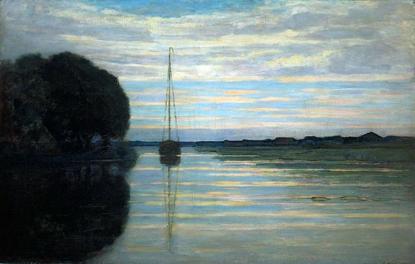 Editor: Here we have "Lake," an oil painting by Isaac Levitan. It looks like it was done en plein-air, capturing a vast open sky over a still lake. What strikes me is the painterly quality; you can really see the brushstrokes. What do you see in this piece? Curator: I see the legacy of labor embedded within those brushstrokes. "Lake" exemplifies the increasing availability and industrial production of oil paints during Levitan’s time. Consider the shift from artists grinding their own pigments to purchasing them ready-made. This impacted not only artistic labor, liberating the artist from the tedious, time-consuming aspects of art creation, but also expanded the possibilities for artists to explore impressionistic techniques through mass production. Editor: That's fascinating, I hadn't considered the impact of paint production itself. So, are you suggesting the availability of pre-mixed paint influenced the move towards "en plein air" painting? Curator: Precisely! Think about it: pre-mixed paints in tubes were more portable. The availability and use of those materials had a dramatic shift in the art-making practices. Landscape painting moved from the studio into nature, radically changing both its production, its accessibility, and our appreciation for the value of time. How else do you read the relationship to value here? Editor: I see what you mean! The painting celebrates leisure, a direct result of industrialized production, now applied even to artmaking. It encourages the viewers to slow down, notice how light interacts with the surface of the water and the cloud formations. It makes you appreciate something beautiful created through the accessibility of modern materials. Curator: Exactly. It's a fascinating commentary when you consider how industrial production ultimately informs this romantic depiction of nature. Thanks for walking through this painting with me. Editor: Thank you, I’ve definitely gained a new perspective on it!