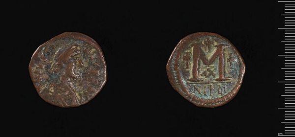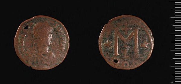 Editor: Here we have a coin, "Coin of Justinian I," from the Harvard Art Museums. Given its age, it seems fragile and worn. What narratives do you see embedded in this object? Curator: This coin embodies power and religious authority. Justinian I used coinage to project his image and Christian ideology across the Byzantine Empire. Consider how this simple object functioned as propaganda. Editor: Propaganda through currency. That's interesting. So, seeing Justinian's face every time someone made a purchase reinforced his power. Curator: Exactly. And the symbols, likely religious, reinforced the merging of church and state, further legitimizing his rule. How does this connection between art and power resonate today? Editor: It shows how art always serves a purpose. I'll never look at money the same way again! Curator: Indeed! Questioning these objects and their purpose is key.