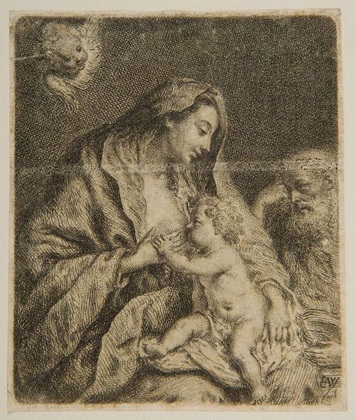 Curator: Let’s examine this "Madonna and Child" by Guido Reni. The artwork can be found at the Harvard Art Museums. Editor: The etching gives off a feeling of tenderness. Look at the delicate lines creating the figures, it's visually very soothing. Curator: Absolutely. The image evokes a specific historical narrative. Consider the representations of motherhood and divinity during the Counter-Reformation. How did societal expectations shape Reni's portrayal? Editor: The composition leads the eye from the Madonna's veiled head, downward in a circular motion ending at the child's hand. The lines, the tonality, it creates a strong aesthetic unity. Curator: I agree. Moreover, exploring the power dynamics, the gaze, what does it say about the role of women, both divine and earthly, during that era? Editor: Perhaps the artist simply sought to capture the essence of maternal love, expressed through purely formal means. Curator: Perhaps, yet even formal choices reflect underlying social and cultural values. Editor: A compelling argument, indeed.