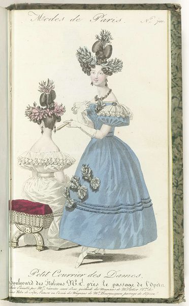 Editor: So, this is a page from "Petit Courrier des Dames" from 1828. It’s a watercolor illustration of women’s fashion, held at the Rijksmuseum. I'm immediately struck by the bows - everywhere! What is the significance of such adornment at the time? Curator: The abundance of bows, yes, quite noticeable. This isn't just decoration; it’s a language. Bows signified femininity, status, and even taste. Think about the meticulous arrangement, the choice of colours – each element would have been decoded within the social circles of the time. These bows reflect societal values. What messages were these women sending? Editor: I guess the message would be of elegance, maybe? Did it also indicate adherence to societal norms or did bows serve any rebellious purposes too? Curator: Elegance, definitely. Norms, in a way yes, though fashion is always a dance between conformity and expression. Note how the bows almost mimic the curves of classical sculpture and reference idealized forms. Can you spot echoes of ancient beauty ideals here? How did classical influences infiltrate everyday fashion choices? Editor: I see what you mean! The flowy silhouette does call back to ancient sculptures. It's intriguing how they used fashion to engage with cultural heritage. And I guess fashion and the role of women must have shifted not long after, considering the impact of photography which allowed fashion to travel across greater distances. Curator: Precisely! Visual culture changes as symbols find new meanings, sometimes losing their power, other times finding renewed significance through mass production. Editor: This has definitely made me see this seemingly simple fashion plate with completely fresh eyes, full of cultural information about femininity in that period! Curator: Agreed. A reminder that even the most delicate adornments can speak volumes.