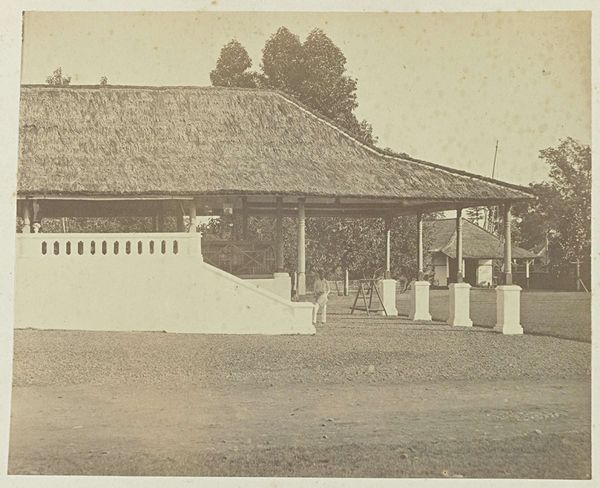 Editor: So, this photograph is titled "De Stadsherberg te Batavia," created between 1865 and 1869 by Woodbury & Page. It’s a gelatin silver print that depicts a street scene. There's something so…still about it, despite the implied hustle and bustle of a city street. What strikes you most about this piece? Curator: What immediately jumps out is the stark contrast between the idealized depiction of colonial life and the potential realities of Batavia at the time. How do you think photographs like this one, meant for a Western audience, contributed to a specific image of colonial life in the Dutch East Indies? Editor: I guess it presents a picture of order and prosperity, almost a romanticized view, right? The neat rows of columns, the waiting carriages… it’s all very composed. Curator: Exactly. It's Orientalism playing out through a photographic lens. Think about the role of photography in shaping public perception. Whose perspective is prioritized here, and whose is omitted or marginalized? The local population, for example? Editor: That's a really good point. You see carriages, but not really anyone walking that is obviously "local", and that does feel like a statement, intentional or not. It’s definitely not a complete picture. Curator: It's about control, wouldn’t you agree? Photographs were powerful tools. They projected authority and influence, shaping perceptions of power and civility. Who commissioned it, how it was disseminated, and what message was being broadcast are important considerations. Editor: It really reframes how I see the image. What looked like just a calm street scene now feels loaded with the politics of the time. Curator: Precisely. Understanding the context – the social, cultural, and institutional forces at play – adds layers of meaning. I always try to remember that a photograph from that era can reflect power as much as it reflects reality. Editor: I’ll definitely look at similar works differently from now on. Thanks for pointing all of that out.
