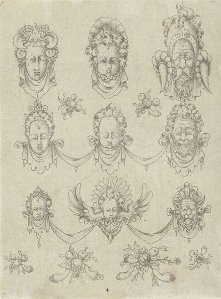 This print, titled 'Nine Masks and Six Small Bunches of Fruit,' was made anonymously using the intaglio process. This involved engraving a design into a metal plate, inking it, and then pressing paper against it to transfer the image. Look closely, and you’ll see the incredible fineness of the lines, created through skilled handwork. The linear quality gives a sense of precision and detail to the masks and fruit, emphasizing their decorative qualities. The intaglio process, while allowing for detailed reproduction, also speaks to a world of labor and skill. Each print would have required meticulous work, linking the final product to the hand of the artisan. Prints such as these played a crucial role in disseminating design ideas. They blurred the lines between art and craft, serving as inspiration for artisans working in various media. The value of this work lies not only in its aesthetic appeal but also in its capacity to influence and enrich craft practices.