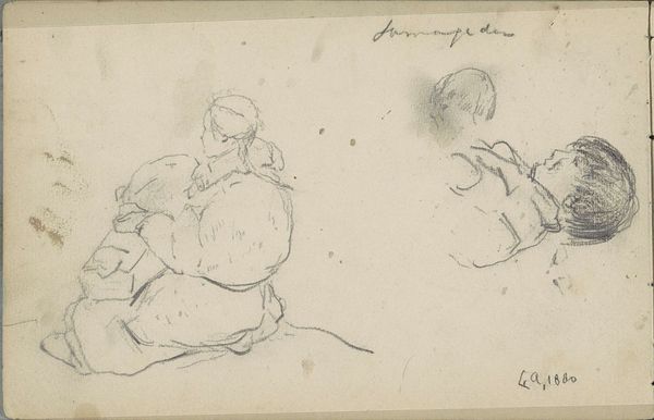 Curator: Here we have "Handwerkende Marker vrouw en een meisje met een pop" by George Clausen, a drawing made with pencil on paper in 1875. Editor: It's wonderfully immediate, isn't it? The sketch-like quality captures a fleeting moment, like glimpsing a scene in passing. There's a starkness to it, but also a tenderness in the woman’s focused posture. Curator: I see it as an insightful commentary on the labor of women, specifically in the late 19th century. This isn't just a casual sketch; it situates the woman within the broader economic realities of the time, representing the burden and the role of labor, class, and gender. Editor: Absolutely, the visual language speaks volumes. The head coverings worn by both figures—what do they signify about tradition and place, and even community belonging? There’s an implied narrative about childhood and inherited roles, and even limitations for girls and women, isn't it? The child clutches what seems to be a simple doll; could it be a stand-in, perhaps, for future motherhood? Curator: It certainly prompts a reflection on the future envisioned—or, more accurately, prescribed—for women of that time. Clausen, though, treats his subject with great respect, focusing intently on the quiet act of her handcraft, and the simple innocence of her daughter by her side. The work also asks us to question whether this seemingly straightforward genre scene reinforces or subtly critiques societal expectations. Is there some commentary on intergenerational poverty at play here? Editor: Perhaps even more compelling is that Clausen highlights how material culture acts a vehicle for passing down meaning. The act of making, represented through this laboring woman, has passed onto this little doll being carried by her daughter, which one day she, too, shall continue to recreate the wheel again. It is a cyclical process, which continues. Curator: I'm left pondering the interplay of representation and reality, especially in a piece like this. How can one drawing carry the weight of societal structures and yet remain so deeply human? Editor: Indeed, it’s the simplicity of the drawing that amplifies its profound resonance. The way the pencil glides across the page hints at layers of emotional complexities underneath—an evocative study from George Clausen, revealing how symbols endure through generations.