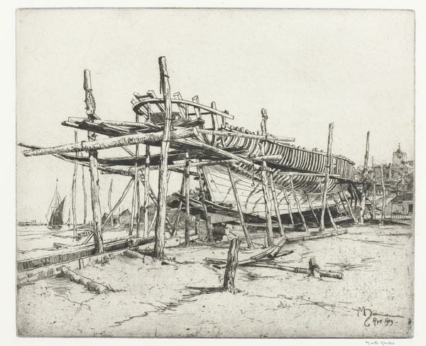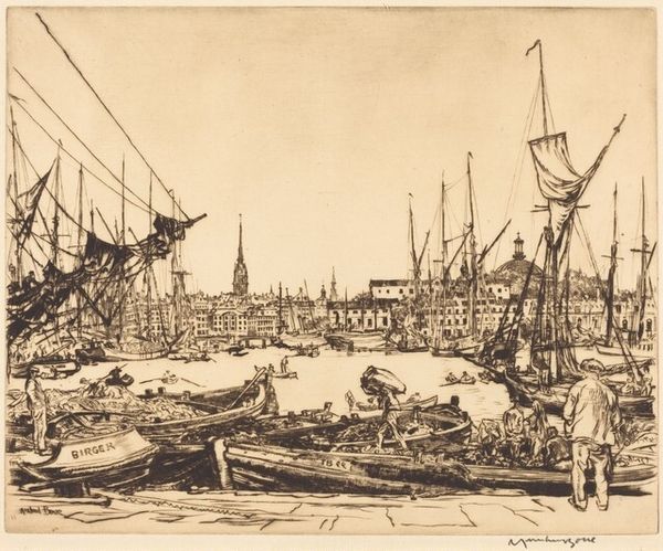 Editor: So, here we have "Dinner-Time on Board the Timber Barque 'Marie' Unloading at Conway," a print made around 1890 by Frank Short. There's almost a sense of chaos in the composition with so many lines and details depicting the ship's rigging. It feels very industrial, and perhaps even a bit claustrophobic. What stands out to you? Curator: What I notice first is how this image encapsulates a specific moment in maritime history, doesn't it? Consider the timber barque itself: a symbol of global trade, of resource extraction and transportation. Timber, a raw material fueling industrial growth, connecting Conway to a wider world. The “Marie” isn’t just a ship, but a node in that complex economic web. Do you notice how the workers become almost secondary to the structure? Editor: I see what you mean. They are small figures tucked into a corner. Curator: They are placed, perhaps intentionally, as secondary elements, like worker bees scurrying within a larger mechanism. That domestic moment of “dinner-time” provides human scale, but look closer. They are practically swallowed by the scene. The symbols aren't obvious, like a religious painting, yet, they are clearly conveying a certain meaning about human life. Is this about the majesty of industrial progress, or a poignant look at humanity's role? Editor: I hadn't considered the symbolism behind something as seemingly straightforward as dinner on a ship. It's interesting how that simple act of eating highlights the wider context. Curator: The seemingly ordinary becomes extraordinary when you decode what those objects symbolize within a cultural or historical narrative. A simple etching can unveil layers of meaning far beyond its surface. Do you feel like you can recognize your own daily rituals reflected in that of the longshoremen eating on the docks? Editor: Now that I think of it, maybe it's not that different! Thank you, that was eye-opening. Curator: A pleasure. Reflecting on the cultural symbols that impact our experiences will surely add insight to future reflections on art.