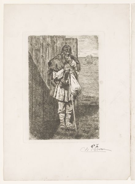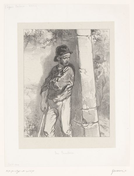 Editor: This is Paul Gavarni's "Zittende oude straatveegster," created in 1852. It's a pencil drawing, and what strikes me is how realistically he captures the weariness in the woman's posture. What draws your eye when you look at it? Curator: Well, as a materialist, I immediately consider the conditions of its production and reception. This wasn't intended as high art, necessarily, but emerged from the social realities of 19th-century Paris. We see here not just a portrait, but a document of labor, represented by the street sweeper's tools. Gavarni isn't just observing, he's engaging with the socio-economic fabric. Notice how the very economy of line reflects her threadbare existence. Editor: So you're saying the cheap materials, pencil and paper, and the sketch-like quality speak to a certain accessibility, perhaps even a political statement? Curator: Precisely! Consider who might have consumed this image, perhaps as a print in a journal. It challenges the dominant narrative of the time, giving visibility to the working class. The means of production, the widespread availability of prints, democratized art and allowed for social critique to circulate more freely. How do you think that contrasts with painting of the time? Editor: It's fascinating to think about art not just as something beautiful, but as evidence of social conditions and production. Curator: Exactly. By examining the materiality and distribution, we can better understand its cultural significance. Editor: I'll definitely look at drawings differently now. I learned so much. Curator: As did I; thinking about the implications of art through a social lens offers invaluable insights.