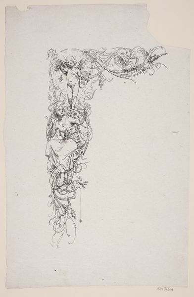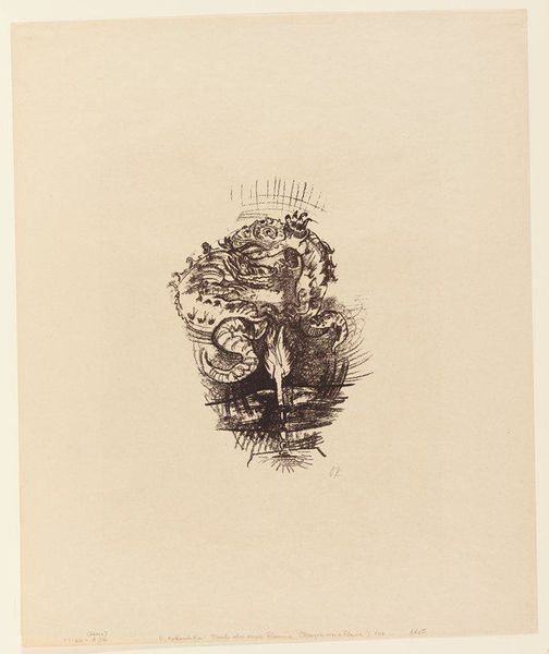 François Courboin created this artwork titled 'Vrouw leunt achterover met een schedel in haar hand', an etching, sometime before his death in 1926. At first glance, the delicate lines and the subtle play of light and shadow capture a scene steeped in symbolism. Courboin uses etching to create a textured surface where the form emerges from a network of fine lines. Notice how the cross-hatching builds depth, defining the contours of the woman’s figure and the folds of her dress. Her contemplative pose, leaning back with a skull in hand, evokes a sense of mortality. This pose destabilizes conventional portraiture, blurring the lines between beauty and decay. The contrasting elements—the ephemeral beauty of flowers and the stark reality of the skull—function as signs within a complex semiotic system. Courboin invites us to question fixed meanings. The very act of viewing becomes an interpretation, shaped by our own understanding of cultural codes.