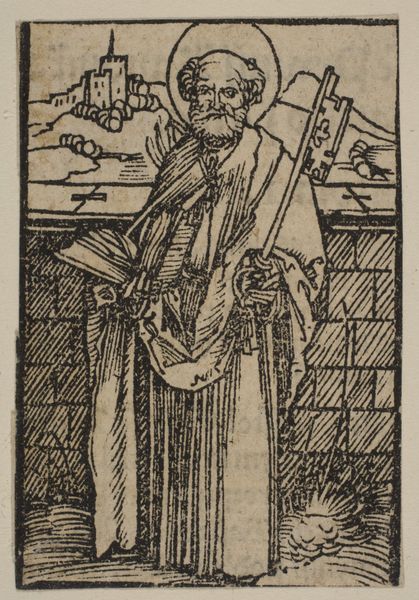 Monogrammist HCVS created this woodcut, entitled Heilige bij een hek in een berglandschap, of Saint at a fence in a mountain landscape, at an unknown date. The figure, presumably a saint, stands in an ornately patterned robe with a palm frond in one hand and a ladder-like gate in the other, set against a mountainous backdrop. The image operates within the visual language of its time, where symbols and figures were immediately recognizable. Yet, there is a personal element here too. How does the figure's ambiguous gaze and somewhat awkward stance disrupt the conventional representation of saints? How does the inclusion of a seemingly mundane object like a gate subtly shift our understanding of holiness and access? This piece invites us to reflect on who is deemed holy and who gets to decide.