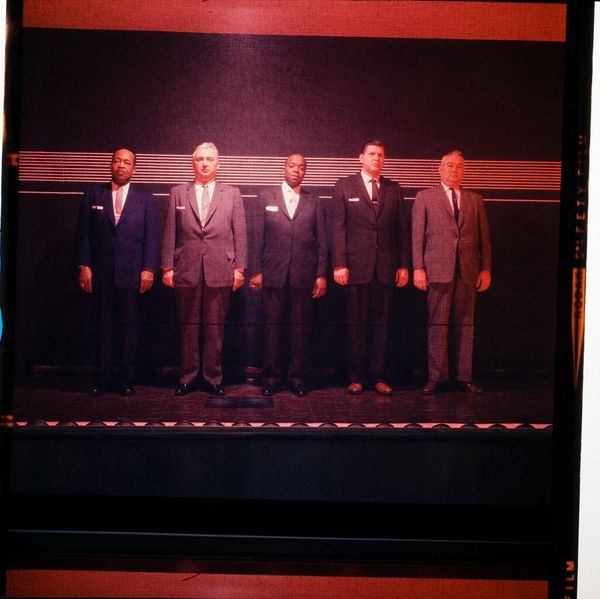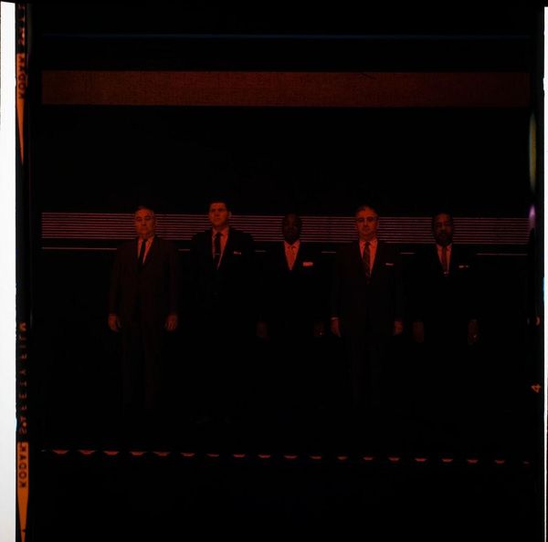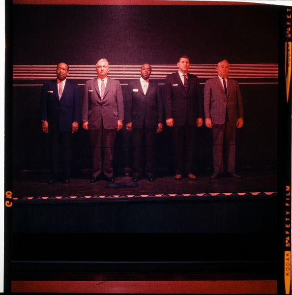 Editor: This image, titled "Untitled (men wearing suits standing in a police line-up)" by Jack Gould, is quite small, only about 5.7 cm square. The subjects' expressions feel so stoic. What do you see in this piece? Curator: The line-up has become an enduring symbol of power and justice, or lack thereof. Do you notice how the suits, meant to convey respectability, become visual masks? Each man is reduced to a stereotype, laden with societal expectations. Editor: I hadn't thought about the suits that way, but you're right. It's like their individual identities are being erased. Curator: Exactly. This image reminds us that the symbols of justice can be easily manipulated. The photograph becomes a mirror reflecting our own cultural biases and assumptions. Editor: I see. It's a powerful commentary on how easily appearances can be deceiving. Curator: Indeed. The symbolism of the police line-up is a cultural shorthand, instantly evoking ideas of guilt and innocence, power and vulnerability. Food for thought.
