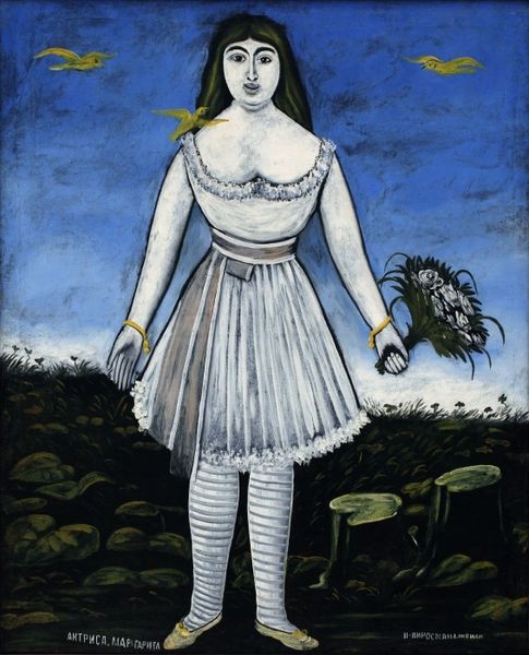 Curator: Niko Pirosmani's "Girl with a Balloon" captures something so uniquely Georgian in its stark simplicity and powerful naivety. Editor: I'm struck by how heavy the paint is laid on. There’s a certain earthiness in how the colors sit on the canvas, particularly that deeply textured yellow hat. It suggests he was perhaps more resourceful than he was concerned with formal painting techniques. Curator: Absolutely, Pirosmani worked primarily in house paint on oilcloth. That directness is key to understanding his raw, emotionally driven aesthetic. Look at the balloon—its color and the stenciled stars suggesting childlike wonderment, yet slightly melancholic, don’t you think? Balloons, throughout history, often mark celebrations or the ephemeral nature of life. Editor: Interesting that you pick up on that sadness. To me, it's about resourcefulness again. The way the skirt looks constructed—the white decorative edges and thick red band—speak to repurposing what materials were available, not necessarily trying to project high-society status. Even her shoes appear homemade! Curator: A sharp observation. The materiality does reflect the context in which it was made. Yet, the balloon itself, floating against the deep indigo, offers an uplifting counterbalance, a symbol that transcends the immediate environment of poverty or constraint. I read it as an embodiment of hope rising against the backdrop of hardship. It may reveal a deeper truth of resilience, or a quiet triumph of imagination. Editor: So, seeing how both meaning and construction align gives the work even greater poignancy. I hadn’t initially picked up on that reading, but seeing Pirosmani’s artistic constraints informing our view enriches my sense of its emotional complexities. Curator: Indeed, looking closely at both the symbolic language and materiality allows us to recognize not only what is being depicted, but also what that might tell us about the world that shaped its creation, and what this means for us now.