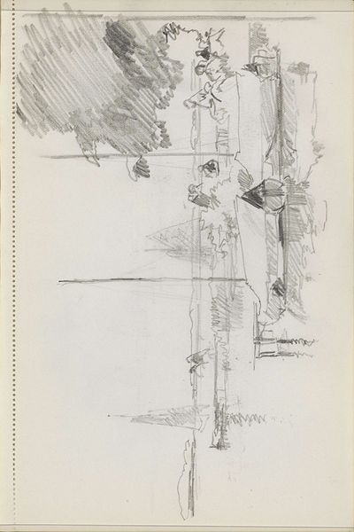 Curator: This pencil drawing, located in the Rijksmuseum, is entitled "Two Seated Men in a Rowboat near a Dock". Cornelis Vreedenburgh likely produced it sometime between 1890 and 1946. Editor: The sketch certainly possesses an evocative simplicity; the subtle suggestion of figures almost lost within the environment imparts a tranquil quality. What is immediately compelling is its sense of impermanence, a fleeting impression captured on paper. Curator: Indeed, this immediacy offers us insights into the cultural value of leisure. Think about it: the act of boating itself. Was it a common pastime, accessible across social classes during that period, or a leisure pursuit indicative of privilege? Editor: Visually, the application of pencil lines seems deliberate. There's a hierarchy, thicker lines describing the central subjects—two seated men—while fainter lines map out their setting, enhancing the contrast. This stylistic decision enhances clarity and focus. Curator: And if we examine his use of line in representing architectural elements alongside these figures, we might assume that it captures a moment of intersection between urbanization and individual experience. What narrative power rests, simply, with depicting individuals near constructed places? What story might he have tried to convey? Editor: Its restricted use of lines forces the viewer to engage more dynamically with this artwork; our minds inevitably complete what the sketch withholds, thus forming a bridge of personal meaning. Curator: Art indeed serves as both a reflector of, and agent within society, mirroring as it also helps to shape society's conventions. This piece could even encourage us to see, anew, those very conventions within our contemporary lives. Editor: I concur entirely; a compelling lesson about seeing through suggestive means, even for art that has few of its own formal certainties.