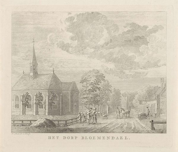 Editor: Here we have Muyck’s "Leerbroek," an engraving dating from around 1740 to 1760. It depicts a quaint village scene. It feels very precise. How would you interpret this work from a formal perspective? Curator: Well, considering it through a formalist lens, we must attend to its composition and line work. The clear division between the foreground, with its strong diagonal leading lines, and the more diffuse background creates a spatial dynamic. Do you notice the variation in the mark-making? Editor: Yes, there's a contrast. The foreground has denser, darker lines creating a sense of weight, while the background is lighter and more open. The tree on the left side feels quite textured with all those dense marks. Curator: Precisely. Note how Muyck employs hatching and cross-hatching to modulate tone and volume. It creates the illusion of three-dimensionality on a two-dimensional surface. The steeple pierces through that layered system, adding verticality, a counterpoint to the earth-bound horizontality. Is this division important, do you think? Editor: I suppose it breaks up what could have been just a static scene? So that tension really comes from that calculated composition, not a story? Curator: Indeed. For a formalist, meaning resides not in external references, but in the interplay of forms themselves. It's about the visual mechanics, the semiotic grammar, if you will, not the narrative. The use of visual elements creates meaning, and is therefore an aesthetic response. Editor: So, appreciating it as an arrangement of lines and forms brings a whole new depth. Curator: Absolutely. Considering the piece’s formal components, how the artist composed elements like light, shadow, texture, and line in relationship to each other to guide our experience of viewing it offers a different appreciation. Editor: That makes me look at it in an entirely new way!