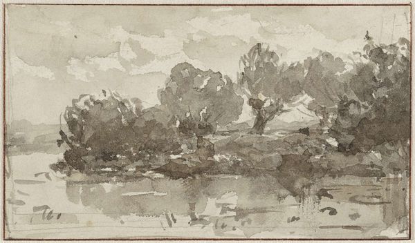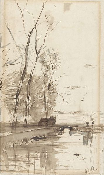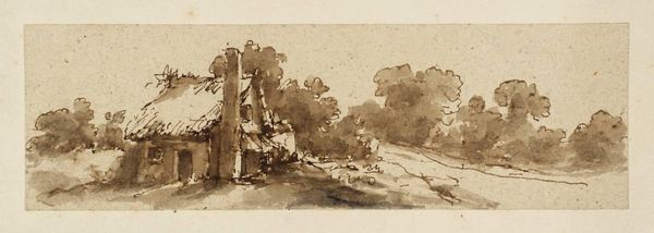 This is "Landschap met boerderij" or "Landscape with Farmhouse" by Willem Roelofs, created with pen in brown and brush in gray. It is currently held in the Rijksmuseum. The artwork presents an atmospheric landscape, dominated by muted tones and the subtle interplay of light and shadow. Roelofs masterfully employs a limited palette to evoke a serene yet melancholic mood. The composition is structured around a central cluster of trees and a farmhouse, which anchors the scene. These elements are rendered with loose, fluid brushstrokes, suggesting form rather than precisely defining it. The artist's emphasis on texture and tonal variation invites us to contemplate the essence of the Dutch landscape. The strategic use of negative space creates a dynamic relationship between the various elements. The artwork challenges the traditional notions of landscape art by focusing on the intrinsic qualities of the medium and the subjective experience of space and light. This emphasis on form, rather than just representation, aligns Roelofs with a broader cultural and philosophical shift towards abstraction and conceptual art.