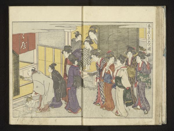 Kitao Shigemasa’s "Hakuba no Sechie" is a woodblock print with subdued colors that captures a formal court scene. The arrangement of figures and architecture offers a glimpse into Edo period Japan. Notice the spatial organization, split into two distinct yet connected panels. On the left, a group of figures stands near a raised structure, while on the right, another group accompanies a white horse, all set against a pale background. Shigemasa balances the composition by contrasting the dark robes of the figures on the left with the lighter attire of those on the right, drawing the eye across the entire artwork. This division of space and the rhythmic placement of figures work to create a semiotic system of signs. The arrangement invites a reading of social relationships and ritualistic practices. The white horse itself—"Hakuba"—becomes a symbol of purity and imperial power, suggesting themes of governance and social harmony. The lines within the architecture and the folds of the clothing add a textural richness. The pale sky is not merely background but a subtle element that destabilizes any fixed reading, leaving room for interpretation and reflection.