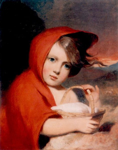 Curator: It's hard to believe this serene image is connected to such a frightening tale. This is Thomas Sully’s “Sarah Esther Hindman as Little Red Riding Hood,” painted in 1833, using oil on canvas. Editor: It has a sort of staged innocence about it. The red cape pops, of course, but it’s the texture of that rock, the way the paint is laid so thickly, that really grabs me. I wonder where that stone came from. Was it brought in specially for the portrait? Curator: Well, Sully often infused his portraits with allegorical elements. Red Riding Hood, in her most familiar symbolic guise, treads the perilous path between innocence and the loss of innocence, doesn't she? Editor: Sure, but thinking materially, that cloak, that dress… They're incredibly important signifiers. The fineness of the fabrics would have been understood, consciously or not, as symbols of class and status. That detail speaks volumes. The red cloak would’ve held tremendous color-fastness, which means longer dye and labor-intensive mordanting. Curator: Yes! Red holds an intense semiotic weight – danger, passion, transgression… Think of the long cultural history from ancient rituals to its present use. Sully deftly layers those associations with the seemingly innocent image of a child. The way she grips the basket, perhaps more tightly than she needs to, betrays the underlying tension. The viewer knows what she is facing. Editor: I suppose it’s knowing who paid for the picture – the socio-economic conditions that allowed for that display of status that fascinates me. The labor conditions and exploitation involved in obtaining materials… Curator: It is impossible to detach this image from its cultural implications. It is part of a continuum. She is almost too aware. The archetype she represents and the story she tells, the layers, the way this is translated in paint– it continues to echo. Editor: All true, yet someone, likely many someone's, worked long hours for Sully to receive a fair amount of materials with which he constructed the final artwork. So there is more than just myth-making going on, and acknowledging is essential to thinking responsibly about its presence in a museum collection like ours. Curator: A darker interpretation than Sully likely intended. Editor: Perhaps, yet I believe, in exploring its manufacture, its cultural purpose as something produced and consumed in 1833, the Red Riding Hood’s red has far greater, and more profound implications for the world.