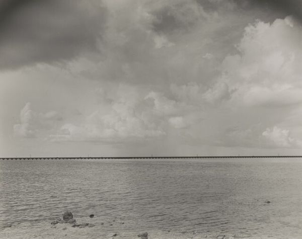 Curator: Robert Adams’ “Southeast from Cape Disappointment, in Washington, across the Columbia River to Oregon,” taken in 1990, is a gelatin silver print that offers a contemplative vista. Editor: The image possesses a stillness, almost a melancholic quietude. The grey scale contributes, but it’s also in the composition - a sense of distance and quiet anticipation. Curator: Consider how Adams has framed the composition. The strong diagonal of the power line on the right and the earth’s gentle curve lead our eye across the flat expanse of the water toward the horizon. It almost partitions the scene, creating visual tension. Editor: Right. I see that long jetty almost as a metaphorical extension of human will pushing against nature. There’s the vast, potentially chaotic ocean, then this imposed, linear structure asserting order. It reflects humanity’s timeless ambition to control its environment. Curator: Interesting interpretation! One might also examine the power line— a symbol, literally, of power, of connection. But it also represents intrusion, an anthropogenic interruption of the natural scene. Note also the delicate gradations of light and shadow in the clouds and on the water, contributing to an overwhelming atmospheric effect. Editor: Visually, the clouds mirroring the water's surface enhance this dialogue between sky and sea. Symbolically, water often represents the subconscious, the fluid, the emotional realm; while clouds, are, dreams, imagination – there’s a lot of reflection happening. Curator: Precisely. And within that interplay, Adams subtly includes this man-made element. This juxtaposition of natural and industrial is an element present in much of his work. Editor: Considering that, the inclusion feels almost cautionary. The stark contrast between the unyielding jetty and the expansive ocean resonates on multiple levels, almost as a cultural warning of humanity's impact. Curator: It invites introspection, definitely. Its formal elements work beautifully together. Editor: It's certainly given me a fresh view, not just on this piece, but on its implications.