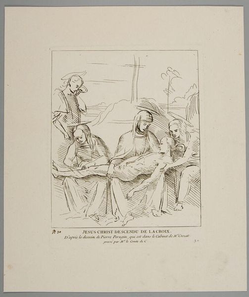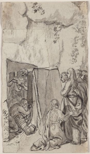 Curator: Welcome. Before us, we have a 17th-century drawing entitled "Prediking van Christus," or "Preaching of Christ," crafted with ink and pen by an anonymous artist. Editor: The first impression I have is how raw and immediate it feels. The pen strokes are so minimal, but they still manage to convey such depth of emotion. You almost get the sense of eavesdropping on an intimate moment. Curator: Absolutely. The hasty, almost frantic lines suggest it might have been created as a study or a preparatory sketch. Consider the texture created by the varying line weights and the stark contrast of the ink against the paper; this all tells a story about the artist's process. Editor: For me, it’s the iconic representation of Christ – even in this simple sketch, he is instantly recognizable. The artist is working within centuries of symbolic language and established iconography. Observe the expressions of the other figures: their turbans suggest a foreign or ancient setting. The upward gazes might be meant to depict awe and curiosity. Curator: Indeed, and speaking of material realities, the ink used here—what type, its cost, the availability of paper at the time—these factors significantly dictated artistic production and accessibility in the 17th century. Who could afford to commission art or even buy these sketches, and how does this influence the artist’s decisions? Editor: It reminds me of illuminated manuscripts, where specific colors and symbols held religious weight. While this is not colored, the starkness of the ink arguably serves to emphasize the profound simplicity of Christ’s message. Even something like a simple jug at the bottom is filled with everyday sacredness. Curator: I see your point. Perhaps even the seeming incompleteness—the raw materiality of the drawing itself—resonates with certain Protestant sensibilities of the period, which shunned overly ornate religious objects and favored more direct engagement. Editor: Exactly! The sketch's simplicity encourages us to participate more actively with the spiritual message. So, by delving into the iconography and historical context, we gain a richer understanding of the artwork’s symbolic language. Curator: And by considering the tangible resources and production constraints, we see how even sketches are testaments to particular means of labor. Editor: Precisely! These different perspectives enrich our comprehension and provoke contemplation. Curator: Very true. Art holds a fascinating interplay between ideas and practicalities.