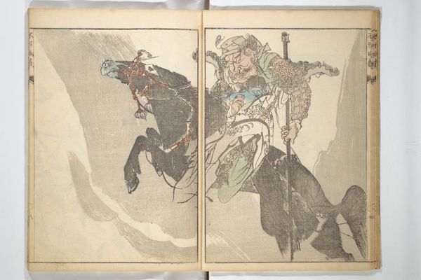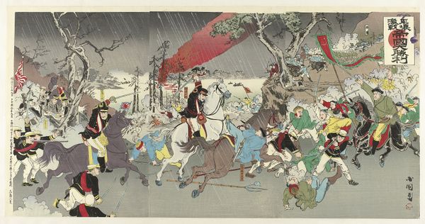 Curator: Before us we have "General Sasa Narimasa in a Heavy Snowstorm", a striking 1897 woodblock print by Yoshu Chikanobu currently held at the Rijksmuseum. Editor: Wow. The snow feels almost like daggers. So harsh. There’s a stark beauty in the way the artist captures that brutal winter landscape, don't you think? Curator: Absolutely. Chikanobu utilizes the ukiyo-e tradition here, yet imbues it with a late 19th-century sensibility. You can see it in the meticulous rendering of the samurai's armor and the horse's musculature. Note, also, the economical use of line to suggest a relentless blizzard. It really emphasizes the production values for mass consumption. Editor: He looks so determined. Or is it resignation? I almost feel like I can hear the wind howling through those mountains. I imagine the weight of his purpose mirrored by the sheer physical weight of the snow itself. The journey he must have undertaken... I wonder if his spirit will break. Curator: His journey is as much a product of artistic construction as historical reality. We can trace how printmakers like Chikanobu engaged with mythologized narratives to both celebrate and subtly critique traditional hierarchies, offering commentary on changing socio-political landscapes during the Meiji era through figuration. Editor: Do you think his coat is warm enough? It looks magnificent! It's quite easy to get lost in contemplation about the warrior himself and the artist behind this magnificent work of art! Curator: Precisely! The artistry and social commentary intertwined. This work is more than an illustration, it offers layers that can be peeled. Editor: I completely agree, that consideration of art as a multifaceted material and social production reveals so much. Curator: A good thing we wrapped this up: my fingers were getting cold just from looking at the print. Editor: Maybe hot chocolate later? In any case, let's warm ourselves with a new piece now, shall we?