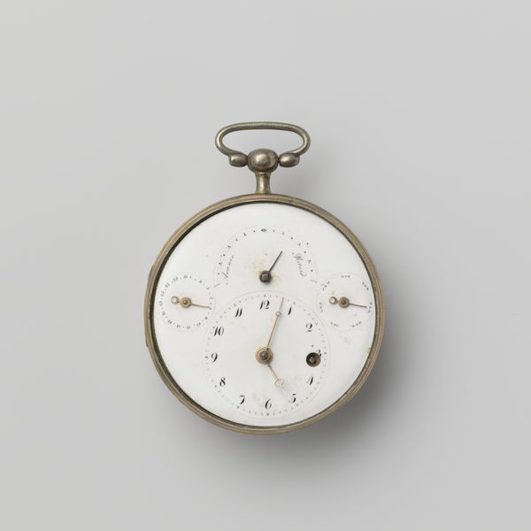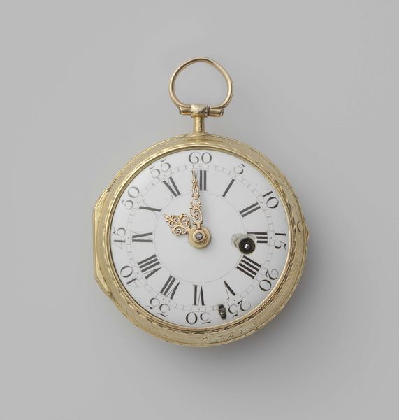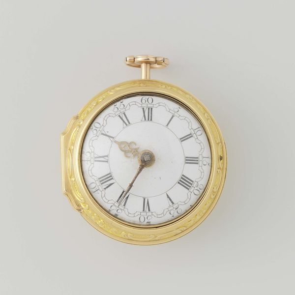 Curator: Here we have a stunning pocket watch crafted by Jean Romilly around 1790-1800. It is gold and features an ornate baroque-style design. Editor: It strikes me as incredibly delicate, almost fragile, a tiny sun of worked gold. I am struck by its preciousness. Curator: Indeed, the watch's intrinsic beauty lies in its refined geometry and intricate details. Note the proportionality of the bezel to the watch face, and the arabesque patterns chased into the gold. Romilly truly masters line and form to convey a sense of elegance. Editor: Yes, but beyond the aesthetic, imagine the labour involved. Each arabesque a testament to countless hours bent over this tiny form. This would not only have taken special skills to master but also involved tedious, repetitive work under poor conditions given the period of manufacture. What were the socio-economic dynamics underpinning its creation? Curator: Such labour elevates it beyond mere craft into an art object, imbued with intellectual intentionality. The watch itself acts as a memento mori, alluding to ephemeral temporality as understood and embraced during this late eighteenth century. Editor: I suppose it also makes us ask, whose time was being meticulously measured by this exquisite object? And at whose expense? It prompts a powerful statement of the material disparities and access to this object. Curator: Of course, the formal elements contribute. The use of gold as the dominant material inherently connects this piece to ideas of value and power structures of society at large. Editor: Right, considering how access to this mineral commodity reflected socio-economic hierarchies, it’s compelling to ponder its broader cultural implications for artisans and owners alike. Curator: It reminds us how beauty and time, whether grasped intellectually or realized tangibly, are forever intertwined with human perception and value. Editor: Indeed, and prompts the enduring paradox: beauty that obscures difficult, material circumstances through preciousness.