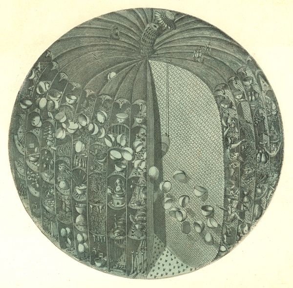 Curator: This piece is entitled "Kingdom of the Absurd by Jonathan Swift" by Oleksandr Aksinin, created in 1978. It’s a print, specifically an engraving. Editor: Oh, I'm immediately drawn in. It feels like gazing into a bizarre, fantastical world, like a peep-hole view into an alien planet governed by strange logic. All that meticulous detail crammed into a circle—it's like a pressure cooker of imagination! Curator: Yes, and note how the circular format contains the chaotic energy within. The meticulous detail you mention is characteristic of Aksinin's work and engraving as a medium. Consider the labor involved in creating these fine lines and the repetitive process, each line a deliberate mark of intention. It echoes, in a way, the repetitive, absurd systems of power it seems to depict. Editor: Absolutely, it speaks volumes, doesn’t it? It whispers of laborious creation, each scratch building this strange world. It feels darkly satirical, almost grotesque. It's a vision that might come to you in a fever dream! And are those dignitaries placed around the circular scene? They look like decorated robots. Curator: Indeed! The characters almost seem to be props within the absurd machinery of governance. Think of the societal critique inherent in printmaking—making art accessible, reproducible, thus questioning elitist art systems. And given its title referring to Jonathan Swift, we have to look for further layers of satiric commentary, pointing towards critiques of bureaucracy, or power structures. Editor: Oh, definitely a jab at systems! The artist’s sense of play with scale and perspective throws me off, heightening the absurd effect, disorienting, making me feel lost inside its symbolic maze. It is nightmarishly captivating. Curator: I agree completely, its complex use of geometric patterns and motifs does provoke disorientation while hinting at deeper structural elements within social and political systems. Aksinin uses these formal methods to encourage our awareness of underlying societal structures. Editor: It reminds us that even beauty, here, feels slightly twisted and sinister! I wonder what prompted this particular trip into the bizarre… Regardless, the impact is rather forceful. Curator: I am left reflecting upon the cyclical nature of absurd power dynamics after observing the artist's formal choices of printing, mark-making, and satirical references. Editor: This intense microcosm will linger with me a good while.