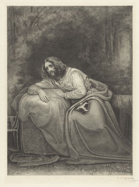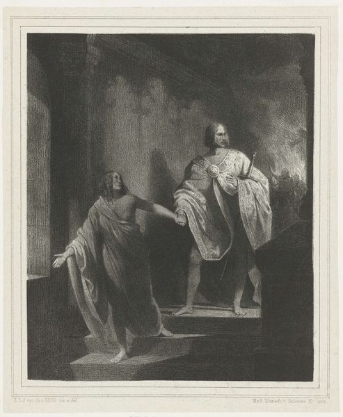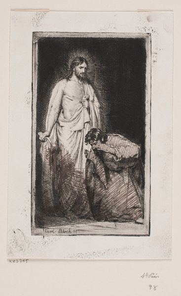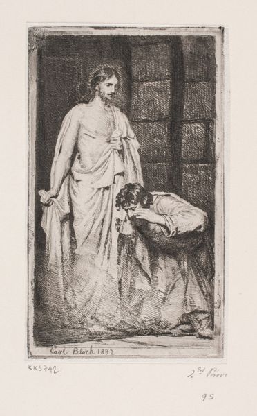 Achille Martinet created this print of "Christus en de overspelige vrouw" sometime during his career in the 19th century. During this time, narratives of morality and religion often intersected with societal expectations, particularly for women. This print portrays a biblical scene where Jesus encounters a woman accused of adultery. Reflect on the visual dynamics at play here: the woman is hunched over, covering her face in shame. Meanwhile, Christ gestures peacefully, his face serene. Inscribed is the powerful declaration: "He that is without sin among you, let him first cast a stone at her." Martinet was working in a society steeped in rigid gender roles and moral judgements. Representations like these offered a lens through which to examine the era’s attitudes toward female transgression and the possibilities of forgiveness. The image, while rooted in religious text, speaks to broader themes of judgement, compassion, and the complexities of human experience. It subtly questions the righteousness of those quick to condemn, urging a pause for reflection before casting that first stone.