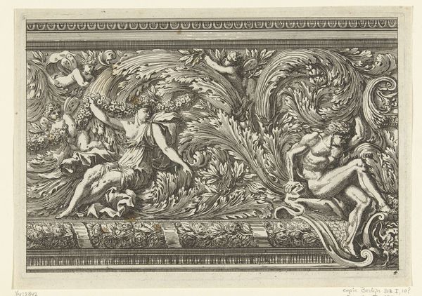 Jean Lepautre made these two friezes with acanthus scrolls and putti sometime in the 17th century. These prints were made through engraving, a printmaking technique where an image is incised onto a metal plate, which is then used to create multiple impressions. The artist would have painstakingly carved the design into the metal, using tools to create lines that hold ink. The depth and density of the lines determine the visual weight and texture of the final print. The friezes are filled with detailed, stylized acanthus leaves and playful putti, or cherubic figures. The repetitive nature of printmaking allowed for the wide distribution of decorative designs, influencing the aesthetics of interiors and furnishings across Europe. The level of skill required for engraving meant it was often a specialized profession, relying on workshops of skilled artisans. Understanding the labor-intensive process of printmaking helps us appreciate the artistry and craft involved in producing these images, blurring the lines between fine art and design.