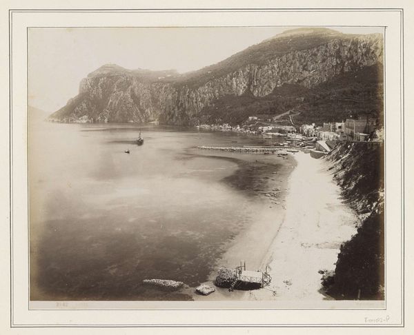 This photograph, "Baai van Garavent, Menton", by Neurdein Frères, captures a sweeping vista rendered in a monochromatic sepia tone. The eye is drawn to the composition's structure, where the landscape’s natural forms intersect with human constructions. The mountain slopes establish a sharp diagonal line from the upper left, countered by the gentle curve of the coastline. This photograph presents a visual dialogue between the solid, unyielding terrain and the fluid expanse of the sea. The structures of the built environment add geometric elements, disrupting nature’s smooth lines with angular shapes, and further highlighting the contrast. It's this interplay between organic and constructed forms, rendered through subtle tonal variations, that gives the photograph its dynamic tension, inviting us to contemplate the relationships between nature and culture.