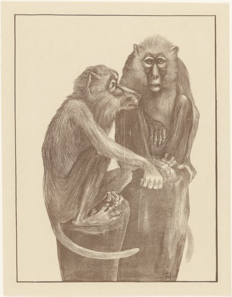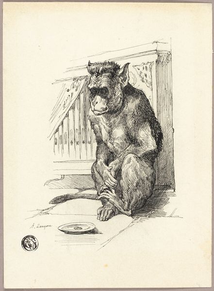 Editor: This is Edwin Henry Landseer's "Orangutang," a graphite drawing on paper. It’s, well, strikingly… human. I'm captivated by how expressive its face is. What do you make of it? Curator: Landseer, wasn’t he the painter of noble stags and Queen Victoria’s pets? To see him sketching an orangutan like this… it feels almost subversive! Look at the almost imperceptible details – the furrow of the brow, the slight downturn of the mouth. Editor: It’s definitely thoughtful… even melancholic. Curator: Exactly. I wonder, was he pondering our place in the grand scheme of things? Or perhaps Landseer simply wanted to observe this creature's remarkable complexity. Look how it holds the stick. Deliberately? Thoughtfully? Are those human-like hands, almost beckoning us? It's unsettlingly brilliant. Do you feel like Landseer is almost toying with the idea of a ‘missing link’ here, stirring up those 19th-century Darwinian debates? Editor: I hadn't thought of that! It's as if the orangutan itself is contemplating evolution. Is that too much of a read? Curator: (chuckles) Honey, art invites a multiplicity of reads! This image dances between scientific study and sentimental portrait, leaving us to ponder where the animal ends, and the human begins… or if there ever really was a boundary. Editor: So much for a quick sketch. Landseer sneaks in a real mind-bender! Curator: Absolutely. Makes you see those cute dog portraits in a whole new, potentially primate-tinged, light, doesn't it?