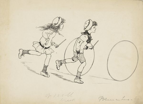 Curator: Immediately striking is the frantic energy captured with just ink on paper. A whirlwind of activity almost spilling off the edges. Editor: Indeed. We are looking at "Den tykke kat," or "The Fat Cat," a drawing crafted in 1911 by Niels Skovgaard. It’s part of the collection at the SMK, Statens Museum for Kunst. Skovgaard, celebrated for his depictions of Danish folklore, truly captures a palpable sense of animated community. Curator: Community yes, but there is an odd separation, socially I mean. Are those fairy figures in the back I spot? A different set of people versus the men and women in the front performing what could only be understood as farm work. Editor: What strikes me about their work is how, from the cross-hatching used to imply density and labor, it presents as crude almost; perhaps by virtue of Skovgaard's simple style, it recalls folk-art traditions, where everyday life and the local vernacular held prominence. But look at how the lines articulate material culture: tools, clothing, all conveying a sense of place. Curator: The material reality intersects strangely with an apparent symbolic realm. Are the dancing figures an evocation of idealized or mythological female figureheads or gender roles of domesticity vs a more masculine outside? What might the titular "fat cat" symbolize here as the women focus their attention toward the earthy work? Editor: The artist also focuses our attention to the laboring class, not just by placing these individuals into the foreground of his work but by virtue of their own positioning next to an almost other-worldly scene that unfolds into further ethereality and wonder. We also mustn't fail to remark how his work also subverts, in the choice of its own simplicity, a certain status or material expectation in what we can expect from art. Curator: Precisely. So in viewing "The Fat Cat," are we encouraged to see the intersections of these seemingly disparate realities. The grounded, labor-intensive lives alongside the realm of myth, symbol, and potentially, resistance? Editor: And moreover, the ways in which Skovgaard uses materials and representation to bring a localized population to light with unique simplicity of character that can also tell a wider tale of shared human experience.